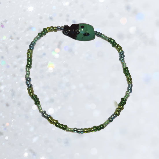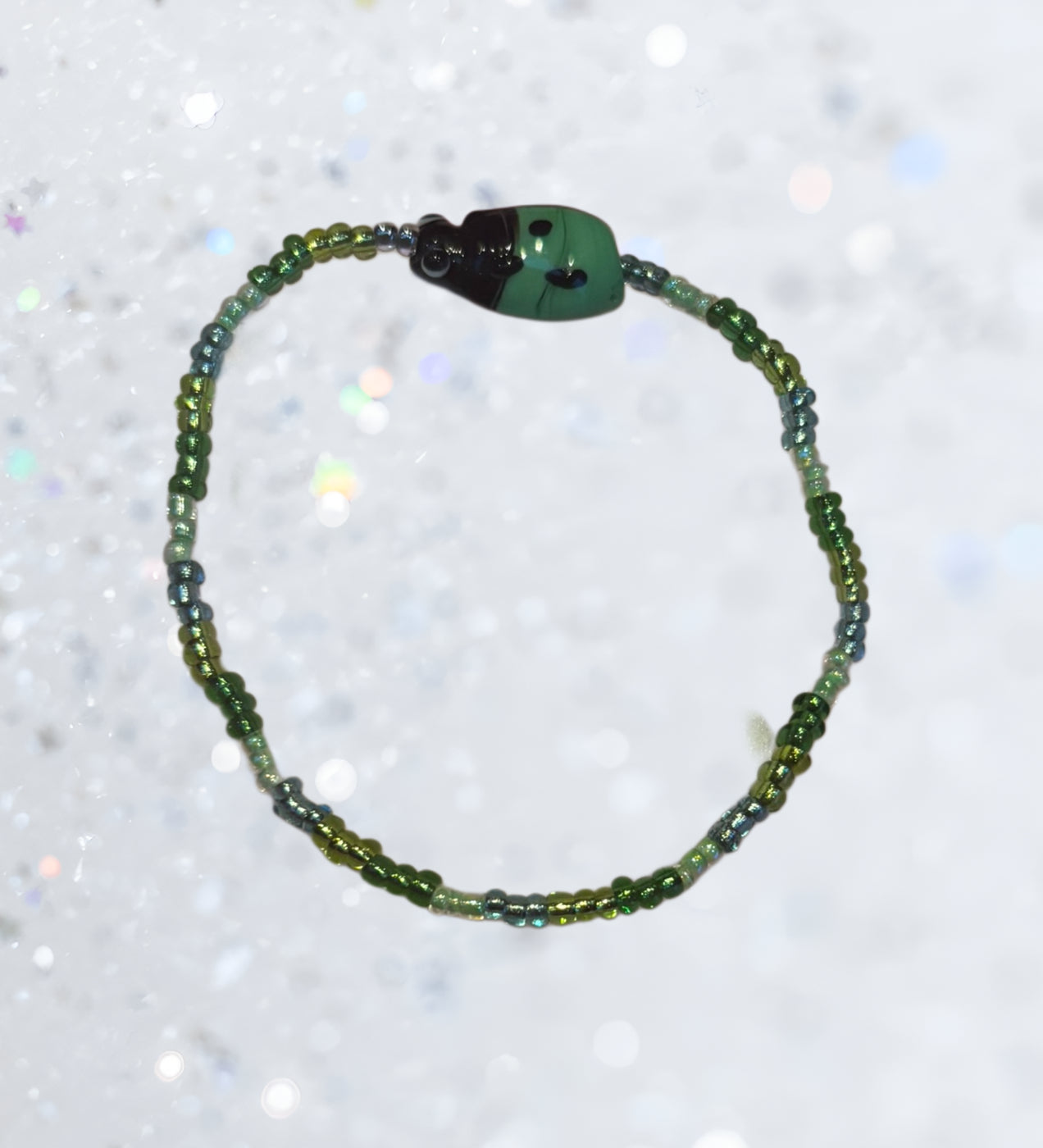 Rekbaar armbandje gemaakt van Miyuki kralen en een glazen lieveheersbeestje