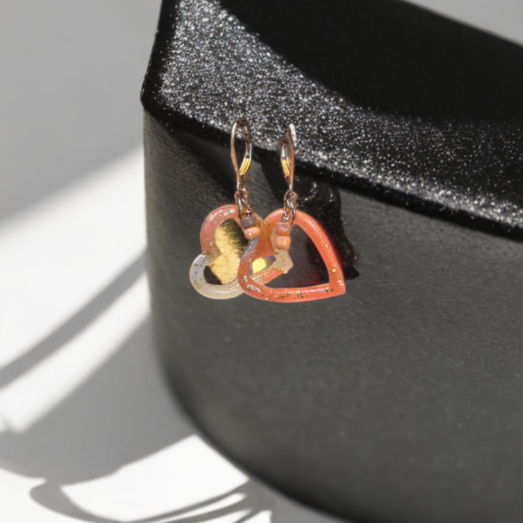 Roségoudkleurige hypoallergene oorhangers met hartjes uit polymeerklei.
