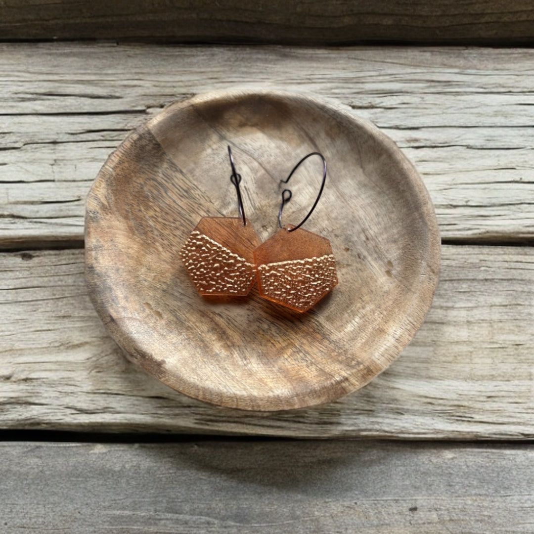 Chocoladegoudkleurige, hypoallergene creolen met resin hangertje.